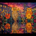 Enchanting Nighttime Owls and Blossoms in Vivid Urban Tapestry