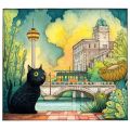 Enigmatic Black Cat and San Antonio Landscapes in Artistic Harmony