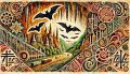 Enchanting Depiction of Natural Bridge Caverns with Bats and Folk Art