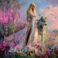 Enchanted Stroll Through Blossoming Meadows With Majestic Wolf