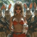 A Surreal Ensemble: Armed Rabbits Guarding a Futuristic Warrior