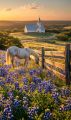 Sunset Over Bluebonnet Fields with Graceful Horse and Historic Texas Church
