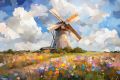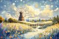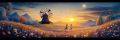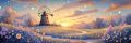 Serene Sunset Over a Picturesque Windmill and Flowery Meadow