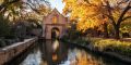 Autumnal Glow at San Antonio's Historic Waterway and Stone Building