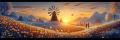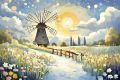 Enchanting Sunset Over a Vibrant Floral Meadow with Windmill