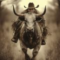 Charging Bull with Cowboy Rider in Misty Texan Landscape