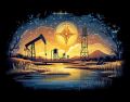 Vibrant Texan Landscape with Cross and Oil Derrick in a Sunset Scene