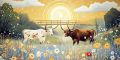 Enchanting Longhorn Cattle in a Vibrant Texan Meadow at Sunset