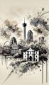 Minimalist Interpretation of The Alamo Against Modern San Antonio Skyline