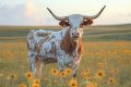 Majestic Longhorn Steer Amidst Blooming Wildflowers at Sunset