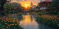 Serene Sunset over the San Antonio River Walk Surrounded by Blooms