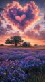 Heart-Shaped Clouds Over Cozy Cottage Surrounded by Bluebonnets at Sunset