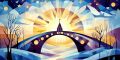 Vibrant Sunrise Over a Stylized Church and Bridge in San Antonio