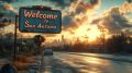 Sunset Glow over San Antonio: A Vintage Welcome Sign and Cityscape
