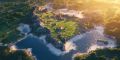 Serene Sunset Over a Lush Landscape with Rocky Outcrops and Water