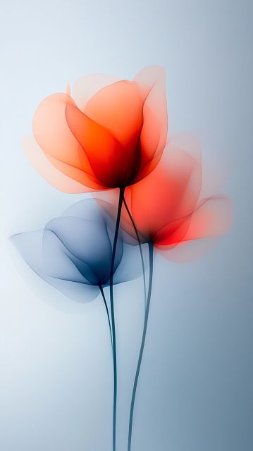 Unveil the enchantment of serenity and grace with "Whispering Hues," an art piece that captures the subtle interplay of color and light through delicate floral forms. An ethereal display of two flowers, one painted with a warm sunrise palette and the other in shades of cool, serene blue, evoke a sense of balance and tranquility. The soft, overlapping petals seem almost translucent, resembling delicate tissue paper illuminated from behind. As the hues blend and merge in gentle gradients, each petal tells a story of harmony and peace. Accents of sleek, dark stems heighten the luminous petals, grounding the airy composition in silent strength. Positioned against a muted gray backdrop, the art draws the viewer into a world of simplistic yet profound beauty. The choice of colors and their precise layering showcase a masterful technique, turning an ordinary subject into a meditation on light and mood. This piece not only decorates a space but also transforms it into a haven of inspiration, where each glimpse reveals subtle nuances and a deeper dialogue between elements of nature and artistic expression.