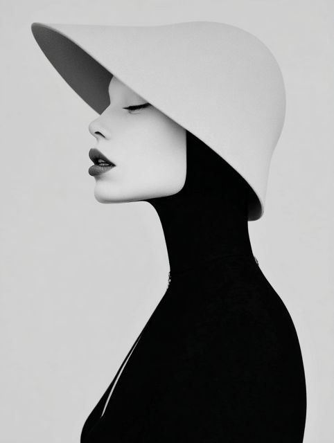 Envelop your space in the undeniable allure of simplicity and sophistication with "Monochrome Elegance", a stunning black and white portrait that speaks volumes through its silence. Evocative of the classic age of fashion photography, this piece features an elegant figure adorned with a striking, minimalist hat that swoops gracefully over her delicate features. The rich contrast between the stark black attire and the luminous white of the hat draws the eye, suggesting a narrative woven from hues of light and shadow. Every curve and contour of this artwork is infused with a sense of serene grace, reminiscent of iconic fashion icons and timeless elegance.