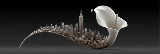 Unveil the majestic beauty of the 'Urban Spring,' a harmonious blend of nature and urban sophistication. In this art piece, a delicate white flower curves gracefully over a miniature version of New York City’s iconic skyline. The flower, superb in its simplicity and purity, stands in stark contrast to the complexity and density of the cityscape nestled delicately along its stem-like structure. The buildings, meticulously crafted with a monochrome palette, echo the hues of twilight, imbuing the scene with a serene yet powerful aura. Silver tones shimmer across this tableau, highlighting the Empire State Building, which pierces the sky as the centerpiece of the composition. This piece invites the viewer to contemplate the symbiosis between urban environments and natural elements, suggesting a world where both exist in mutual enhancement rather than in opposition. The attention to detail in the construction of tiny buildings alongside the petal's smooth contours encourages a thoughtful introspection about balance and beauty in the spaces we inhabit and the environments we create. As the art piece plunges its viewers into a deep, reflective state, it also energizes the space with its innovative and futuristic portrayal of city-life intertwined with nature’s elegance.