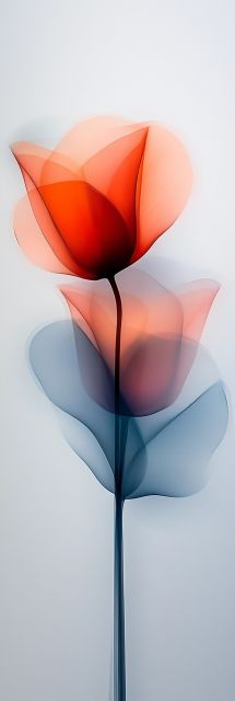 Embrace the elegance and tranquility that this stunning piece of art evokes, featuring two ethereal floral forms rising gracefully against a calm, muted background. The upper blossom glows with a warm, fiery hue of sunset reds and soft oranges, suggesting the vibrant life and passion inherent in nature's creations. Below, its counterpart blooms in serene shades of gentle blues and subtle lilacs, offering a soothing visual counterpoint and symbolizing peace and reflection. Together, these flowers embody a dance of color and light, their overlapping petals creating a delicate interplay of shapes and shadows that captivate and enchant the viewer. The refined simplicity of the composition, combined with the profound depth of color, makes this artwork a timeless piece that speaks volumes about the complexities hidden in natural beauty. It serves not only as a visual treat but also as a metaphor for the coexistence of fervor and calm within our lives. Each petal, with its gentle curves and soft edges, seems to be crafted from light itself, transforming the space it inhabits with an aura of sophistication and inspiration.